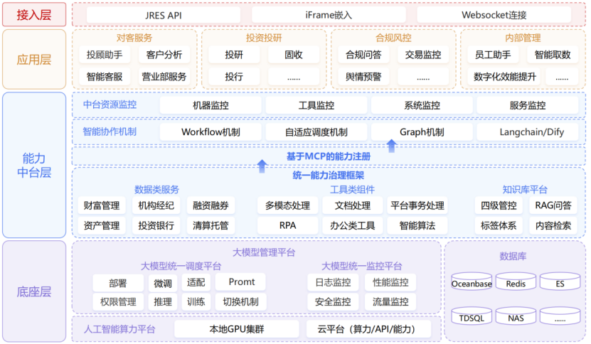 其中,“一體”指自主可控的大模型基座,是整個(gè)服務(wù)體系的核心,保障技術(shù)應(yīng)用的自主性和安全性;“四翼”對應(yīng)對客服務(wù)、投資投研、合規(guī)風(fēng)控、內(nèi)部管理四大核心業(yè)務(wù)領(lǐng)域,全面覆蓋公司關(guān)鍵業(yè)務(wù)環(huán)節(jié)。