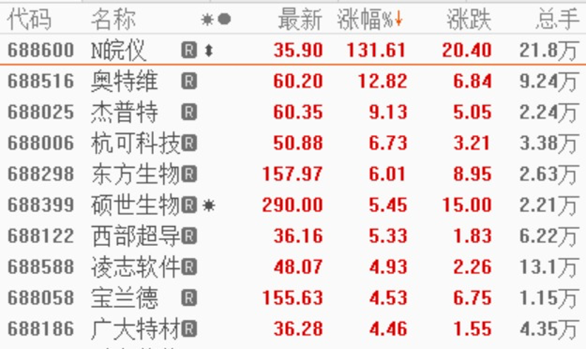 7月3日,兩市情緒持續(xù)高漲,券商板塊受多重利好延續(xù)強勢行情,滬指受此影響漲超2%站上3100點??苿?chuàng)板方面,個股行情出現(xiàn)分化,漲跌不一,截至收盤,54只個股飄紅,64只個股收跌。同時,科創(chuàng)板迎來了第六十八批新股皖儀科技。新股皖儀科技上市首日表現(xiàn)良好,股價報收35.90元,較其發(fā)行價15.50元漲幅高達(dá)131.61%,領(lǐng)漲科創(chuàng)板。除皖儀科技外,奧特維、杰普特、杭可科技、東方生物、碩世生物和西部超導(dǎo)的漲幅也均超過5%。在跌幅方面,雖然科創(chuàng)板過半個股收跌但跌幅普遍較小,跌幅超過5%的個股僅有五只,分別是佰仁醫(yī)療、卓越新能、聯(lián)瑞新材、金科環(huán)境、秦川物聯(lián)。