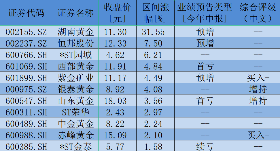 表:8月10日至8月16日,黃金板塊個(gè)股漲幅一覽