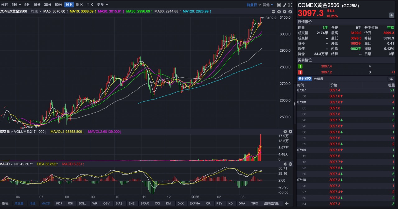 黃金市場(chǎng)避險(xiǎn)交易情緒升溫,3月27日深夜黃金再度狂飆,COMEX黃金6月盤中擊破3100美元/盎司。