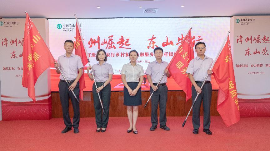 農(nóng)行東山支行行長為新成立的“漳州崛起東山先行”先鋒隊(duì)、突擊隊(duì)和4支特色產(chǎn)業(yè)金融服務(wù)隊(duì)授旗農(nóng)行漳州分行供圖