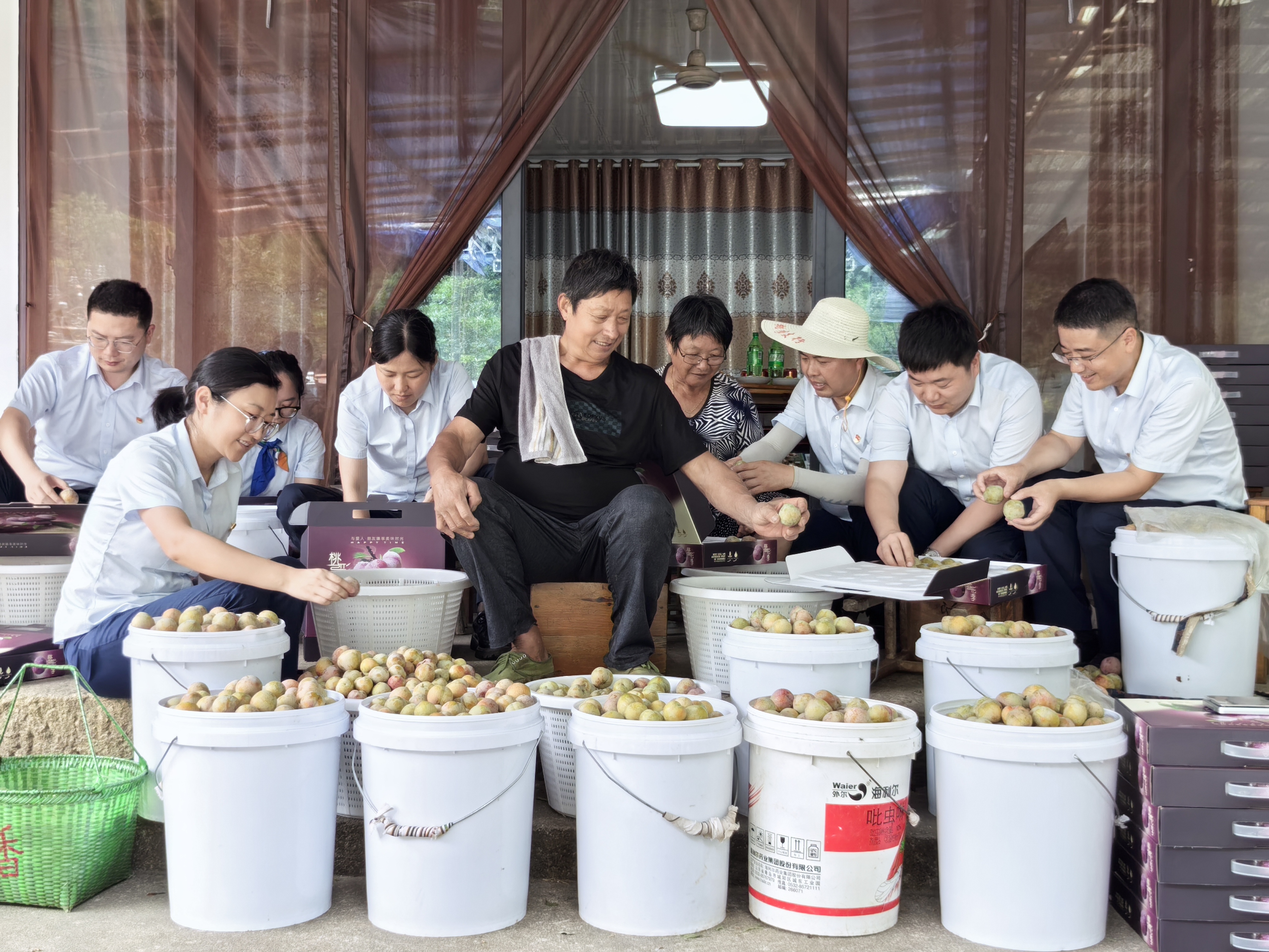 嵊州農(nóng)商銀行工作人員在果農(nóng)呂香忠家中,幫忙挑選、裝箱打包桃形李