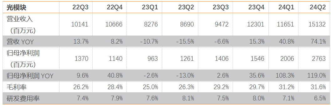 一方面,這一輪人工智能大變革的底層邏輯是大模型&多模態(tài),需要大規(guī)模的數(shù)據(jù)量,因此對基礎(chǔ)設(shè)施拉動非常明顯;另一方面,數(shù)字經(jīng)濟(jì)快速發(fā)展,帶動流量快速增長,光模塊屬于數(shù)字經(jīng)濟(jì)發(fā)展的賣水者。光模塊行業(yè)2024Q1和Q2營收分別同比增長40.8%和74.1%,結(jié)束了8個季度的緩慢發(fā)展(其中連續(xù)3個季度負(fù)增長),2023Q4首次恢復(fù)正增長后,2024上半年逐個季度加速高增長,Q1和Q2歸母凈利同比增速分別為+108.3%和119.0%,反映全球AI拉動光模塊需求全面進(jìn)入高增長,目前主要受益海外,未來有望受益國內(nèi)算力需求增長,因此趨勢有望延續(xù)多個季度。