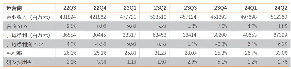 運(yùn)營商2024Q2收入增長1.8%,從2023Q4的7%到2024Q1的4%到Q2逐季放緩,主要原因arpu值壓力,但是利潤端從2023Q4的-1%到2024Q1的6.1%到24Q2的6.2%保持穩(wěn)健增長,說明壓力可控,且由于中國通信arpu值只有全球均值一半&占人民收入約1%,展望未來數(shù)年有望穩(wěn)中有升,因此預(yù)計業(yè)績保持平穩(wěn)增長。