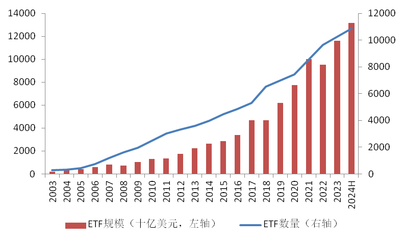 根據(jù)上交所的2024年度ETF行業(yè)發(fā)展報告,截至2024年6月底,全球掛牌交易的ETF資產(chǎn)總規(guī)模達(dá)到13.17萬億美元,較2023年底增加13.44%。近20年的規(guī)模年均復(fù)合增長率超20%,產(chǎn)品數(shù)量更是連續(xù)20年保持正增長。