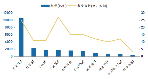 截至10月10日,規(guī)??壳暗漠a(chǎn)品已突破千億元,跟蹤指數(shù)以滬深300等寬基指數(shù)為主,另外,規(guī)模超百億元的ETF合計約56只。