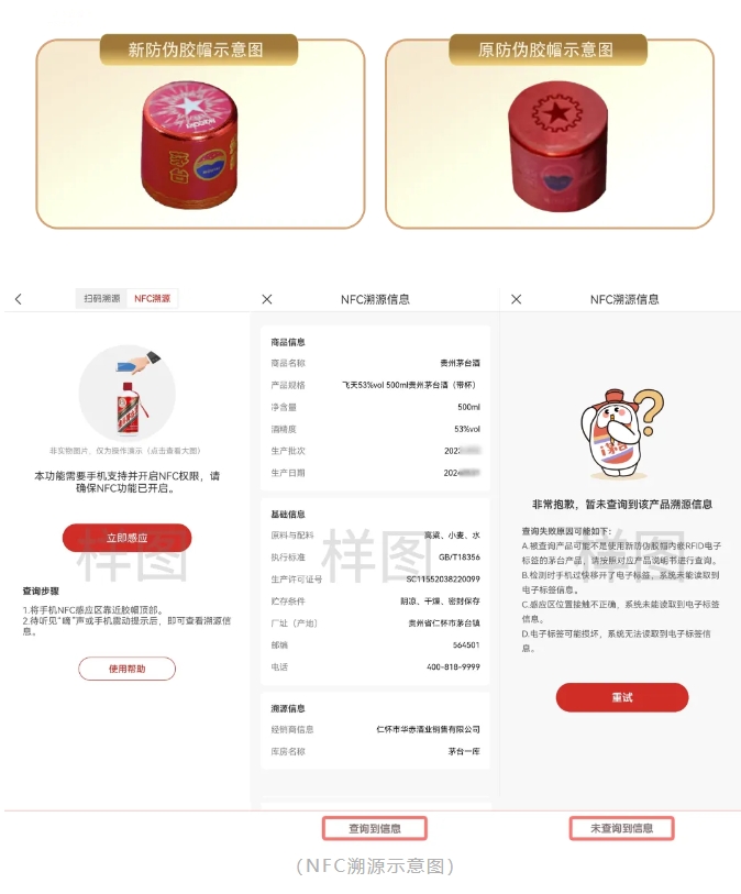 NFC溯源:2023年10月份,貴州茅臺酒啟用新膠帽,膠帽內(nèi)嵌入RFID電子標(biāo)簽,生產(chǎn)日期在2023年10月16日及以后且?guī)履z帽的貴州茅臺酒,可通過“i茅臺App—我的—溯源”進入“NFC溯源”頁面后,用帶NFC功能的手機靠近膠帽即可獲取溯源信息。