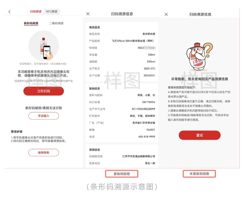 小茅提醒親們,溯源功能是產(chǎn)品流通環(huán)節(jié)重要的信息追溯手段,出具的結(jié)果為“符合”或“不符合”,產(chǎn)品的鑒真還需要通過外觀鑒定、酒體鑒定等一系列手段配合才能得出結(jié)論。