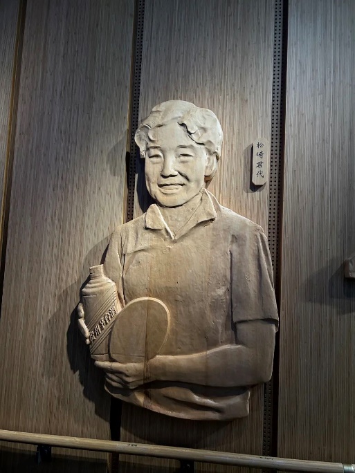 手持茅臺酒瓶的日本前乒乓球國手松崎君代浮雕