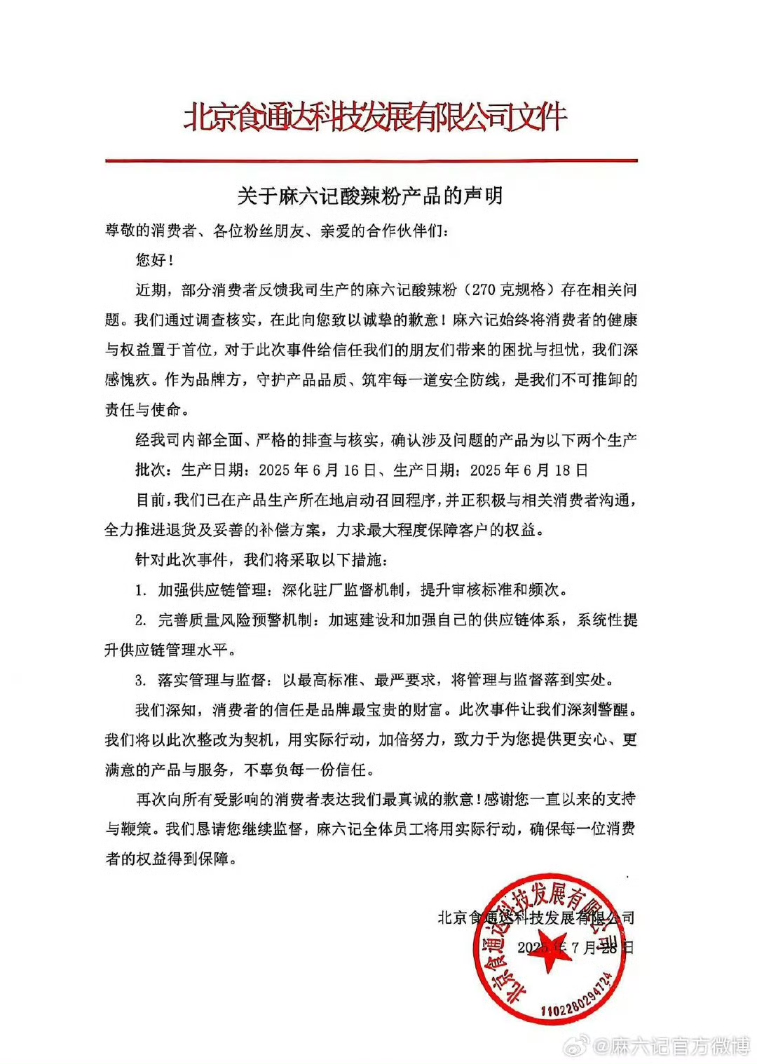 本報(bào)訊 (記者李靜)7月28日下午,麻六記官方微博發(fā)表聲明道歉,稱經(jīng)公司內(nèi)部排查與核實(shí),確認(rèn)涉及問題的產(chǎn)品為生產(chǎn)日期為2025年6月16日、6月18日的兩個(gè)生產(chǎn)批次。麻六記稱,目前,公司已在產(chǎn)品生產(chǎn)所在地啟動召回程序,并正積極與相關(guān)消費(fèi)者溝通,全力推進(jìn)退貨及妥善的補(bǔ)償方案,力求最大程度保障客戶的權(quán)益。
