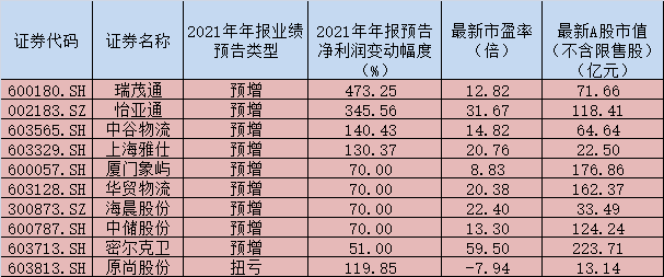 此外,物流行業(yè)喜報迭出。在已披露的2021年年報預(yù)告的13家公司中,共有12家公司業(yè)績表現(xiàn)預(yù)喜。其中,瑞茂通、怡亞通、中谷物流、上海雅仕、原尚股份等5家公司凈利潤有望實現(xiàn)同比翻番。