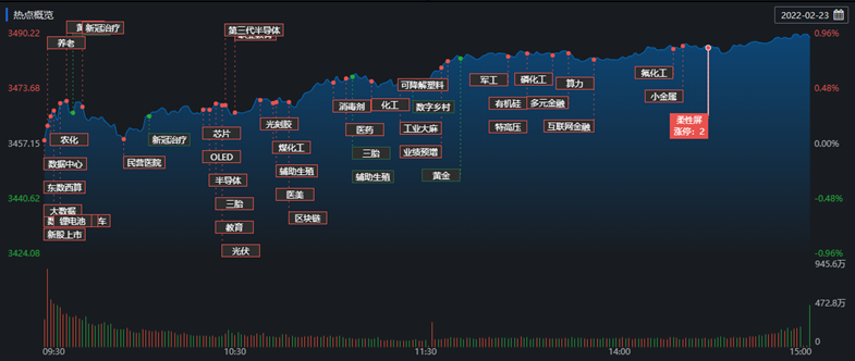 盤面來(lái)看,截至2月23日收盤,上證指數(shù)漲0.93%,深證成指漲1.9%,創(chuàng)業(yè)板指漲2.82%;滬深兩市合計(jì)成交額10409億元,突破一萬(wàn)億元;總體來(lái)看,兩市個(gè)股普漲,有3608只個(gè)股上漲,其中有104只個(gè)股漲停報(bào)收。