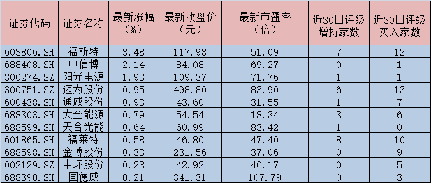 同花順數(shù)據(jù)顯示,截至3月29日,A股風(fēng)電、光伏板塊合計共有66只成份股。其中,有30只個股近30日內(nèi)受到機構(gòu)給予“買入”或“增持”等看好評級,而邁為股份、福斯特、福萊特、金風(fēng)科技、金博股份、大全能源、運達股份、通威股份、隆基股份、晶盛機電、晶科能源、中環(huán)股份等12只個股獲得5家及以上機構(gòu)聯(lián)袂看好。