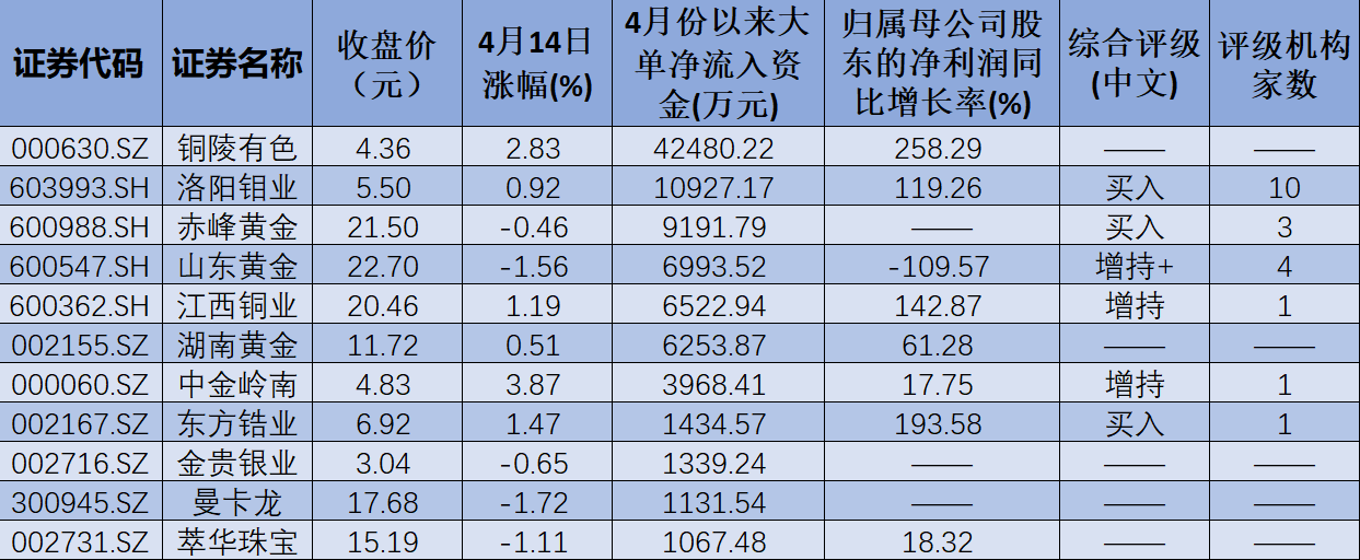 受金價(jià)不斷上行影響,黃金股已開始獲得資金青睞。4月以來,截至4月14日,東方財(cái)富黃金概念板塊期間累計(jì)上漲5.62%。從資金層面看,4月份以來,板塊內(nèi)共有17只個(gè)股獲得大單資金凈流入,期間累計(jì)凈流入額為9.38億元。個(gè)股方面,銅陵有色(42480.22萬元)和洛陽鉬業(yè)(10927.17萬元)的大單資金凈流入額均超過1億元。