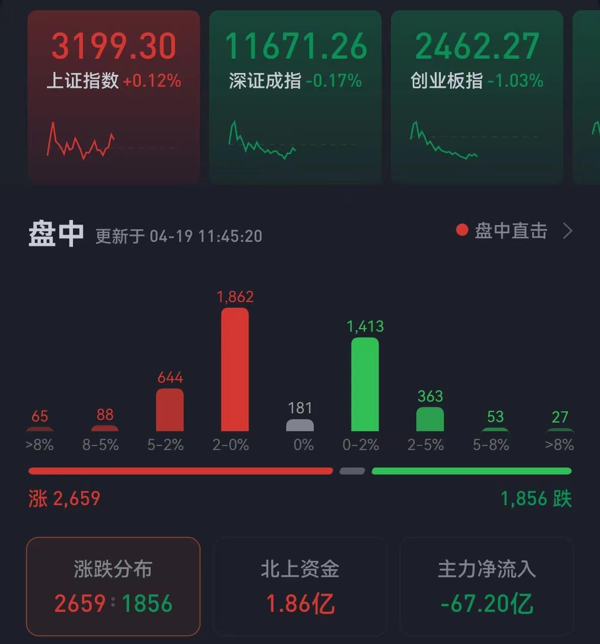 4月19日,A股三大指數(shù)漲跌不一。截至上午收盤(pán),上證指數(shù)漲幅達(dá)0.12%,報(bào)3199.30點(diǎn);深證成指和創(chuàng)業(yè)板指跌幅分別為0.17%和1.03%;滬深兩市合計(jì)成交額4850億元;總體來(lái)看,兩市個(gè)股漲多跌少。