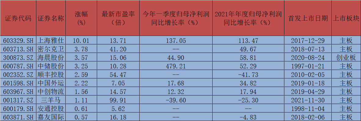 進一步梳理發(fā)現(xiàn),中儲股份、上海雅仕、圓通速遞、韻達股份、飛力達、音飛儲存、海晨股份、華貿物流、中國外運、中創(chuàng)物流、嘉誠國際等11家公司2021年以及今年一季度歸母凈利潤均實現(xiàn)同比增長。