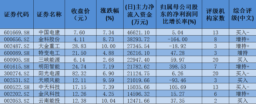 資金也是推動風(fēng)電板塊指數(shù)上漲的重要因素,截至5月19日收盤,風(fēng)電板塊共有100只個股獲得大單資金凈流入,凈流入額達(dá)到42.74億元。其中,包括中國電建、金科股份、大金重工、特變電工、三峽能源、明陽智能、陽光電源、天順風(fēng)能、中天科技、金風(fēng)科技、云南能投等在內(nèi)的11只個股獲得大單資金凈流入額超過1億元。