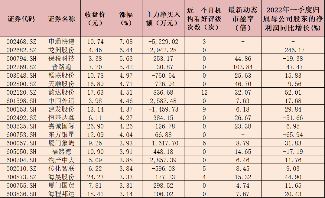 業(yè)績來看,同花順數(shù)據(jù)顯示,物流板塊內(nèi)有28家公司今年一季度歸母凈利潤實(shí)現(xiàn)同比增長,占比近六成,其中,圓通速遞、中儲(chǔ)股份、原尚股份、上海雅仕、東航物流等5家公司今年一季度歸母凈利潤實(shí)現(xiàn)同比翻番。