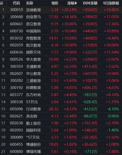 從個(gè)股來看,教育板塊21只交易中的個(gè)股全線上漲,其中,有6只個(gè)股漲停報(bào)收。
