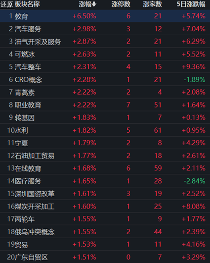 從同花順指數(shù)看,教育板塊指數(shù)漲幅居前,收報(bào)3609.06點(diǎn),漲幅達(dá)6.50%。