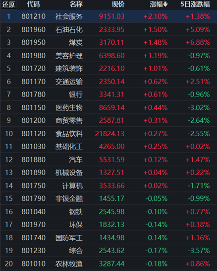 從申萬一級(jí)行業(yè)看,有14個(gè)行業(yè)上漲,社會(huì)服務(wù)行業(yè)領(lǐng)漲,漲幅達(dá)2.10%,另有包括石油石化與煤炭等在內(nèi)的四行業(yè)漲幅均在1%以上。此外,輕工制造行業(yè)跌幅居首,達(dá)0.83%。
