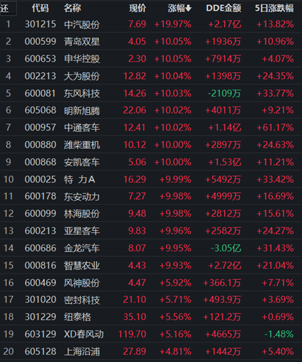 不僅是中通客車,整個(gè)汽車板塊表現(xiàn)突出,尾盤再度拉升,汽車整車板塊尾盤再度拉升,除中通客車11連板外,亞星客車直線封板,安凱客車、金龍汽車回封漲停,漲停股合計(jì)達(dá)15只。