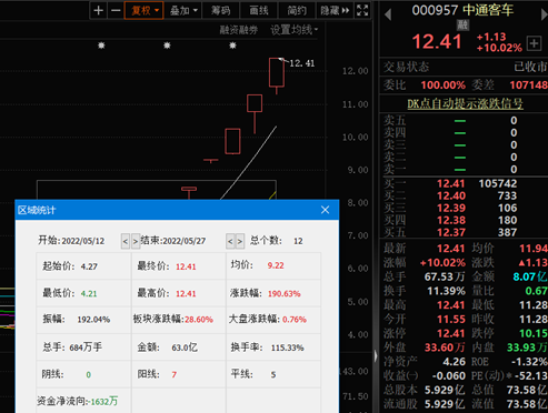 5月27日,中通客車?yán)^續(xù)強(qiáng)勢上漲,開盤12分鐘封住漲停,截至收盤,封板買一單達(dá)105742手。該股自5月12日以來連續(xù)12日上漲,累計(jì)上漲190.63%,最近11個(gè)交易日連續(xù)拉漲停板。
