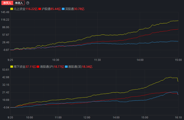 北向資金今日呈凈流入態(tài)勢(shì),全天凈買(mǎi)入116.22億元,其中,滬股通凈買(mǎi)入85.44億元,深股通凈買(mǎi)入30.78億元。
