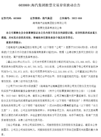 公告還顯示,公司于2022年5月28日披露了《海南海汽運(yùn)輸集團(tuán)股份有限公司發(fā)行股份及支付現(xiàn)金購(gòu)買(mǎi)資產(chǎn)并募集配套資金暨關(guān)聯(lián)交易預(yù)案》《關(guān)于公司股票復(fù)牌的提示性公告》(公告編號(hào):2022-049)等相關(guān)公告,截至本公告披露日,公司正籌劃重大資產(chǎn)重組事項(xiàng),擬以發(fā)行股份及支付現(xiàn)金購(gòu)買(mǎi)海南省旅游投資發(fā)展有限公司(以下簡(jiǎn)稱(chēng)“海南旅投”)持有的海南旅投免稅品有限公司(以下簡(jiǎn)稱(chēng)“海旅免稅”)的100%股權(quán)并募集配套資金(以下簡(jiǎn)稱(chēng)“本次交易”)。目前,公司正在積極推進(jìn)審計(jì)、評(píng)估等各項(xiàng)工作,尚未全部完成。本次交易尚需履行必要的內(nèi)部決策程序,并經(jīng)監(jiān)管機(jī)構(gòu)批準(zhǔn)后方可正式實(shí)施,尚存不確定性。敬請(qǐng)廣大投資者理性投資,注意二級(jí)市場(chǎng)交易風(fēng)險(xiǎn)。