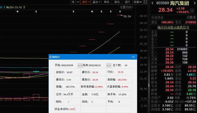 6月10日,海汽集團(tuán)繼續(xù)漲停,這是該股實(shí)現(xiàn)14連陽(yáng)走勢(shì),且最近9個(gè)交易日均實(shí)現(xiàn)一字漲停板,14日累計(jì)漲幅達(dá)181.43%。截至今日收盤(pán),海汽集團(tuán)報(bào)28.34元,成交額達(dá)1.65億元,換手率1.84%,買(mǎi)一封單達(dá)218085手。