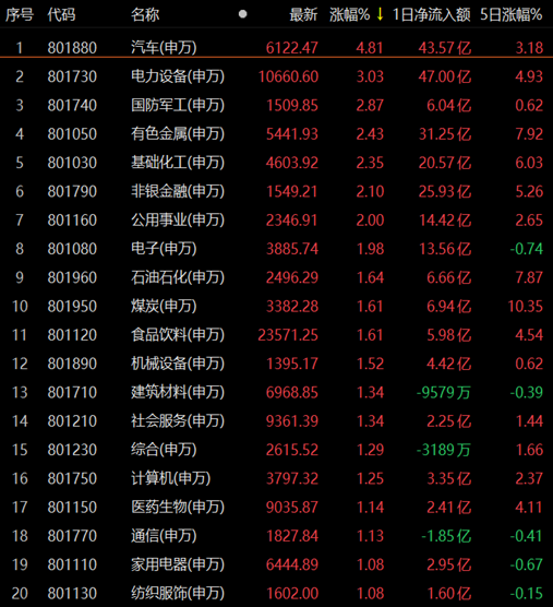 從申萬(wàn)一級(jí)行業(yè)看,汽車(chē)行業(yè)漲幅居前,收?qǐng)?bào)6122.47點(diǎn),漲幅達(dá)4.81%。