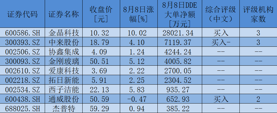 表:8月8日,鈣鈦礦電池概念板塊獲大單資金凈流入個股一覽