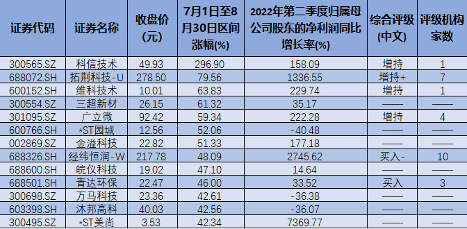 表:7月1日至8月30日,在233只二季度實現(xiàn)扭虧為盈股中漲幅超40%個股一覽