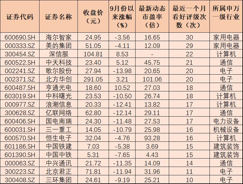 表:最近一個月獲機構(gòu)看好評級次數(shù)10次及以上個股一覽