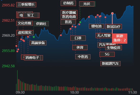 11月2日早盤,A股市場(chǎng)三大指數(shù)低開后震蕩走高,創(chuàng)業(yè)板指漲幅最大。截至上午11:30,上證指數(shù)漲0.88%,報(bào)2995.26點(diǎn);深證成指和創(chuàng)業(yè)板指漲幅分別為1.10%和1.41%;滬深兩市合計(jì)成交額6077.9億元,較前一交易日增長(zhǎng)2.86%。總體來看,A股市場(chǎng)個(gè)股漲多跌少,有73只個(gè)股漲停,跌停個(gè)股1只。