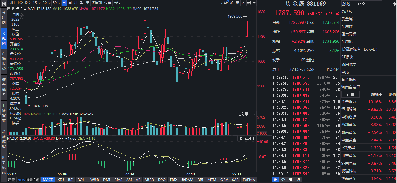 在貴金屬價格上行帶動下,A股貴金屬板塊也比較強勢。11月8日,截至11:30,同花順貴金屬行業(yè)板塊上漲2.92%,位居同花順行業(yè)漲幅榜榜首。個股方面,金貴銀業(yè)漲停。