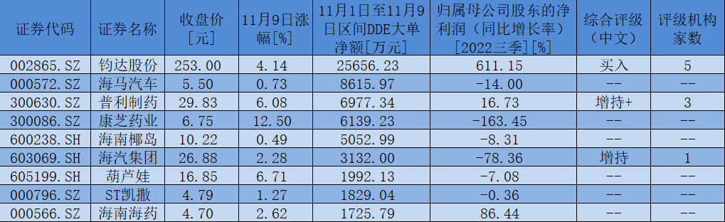 表:11月1日至11月9日,獲大單資金凈流入額超1000萬元的海南自貿(mào)區(qū)板塊個(gè)股一覽