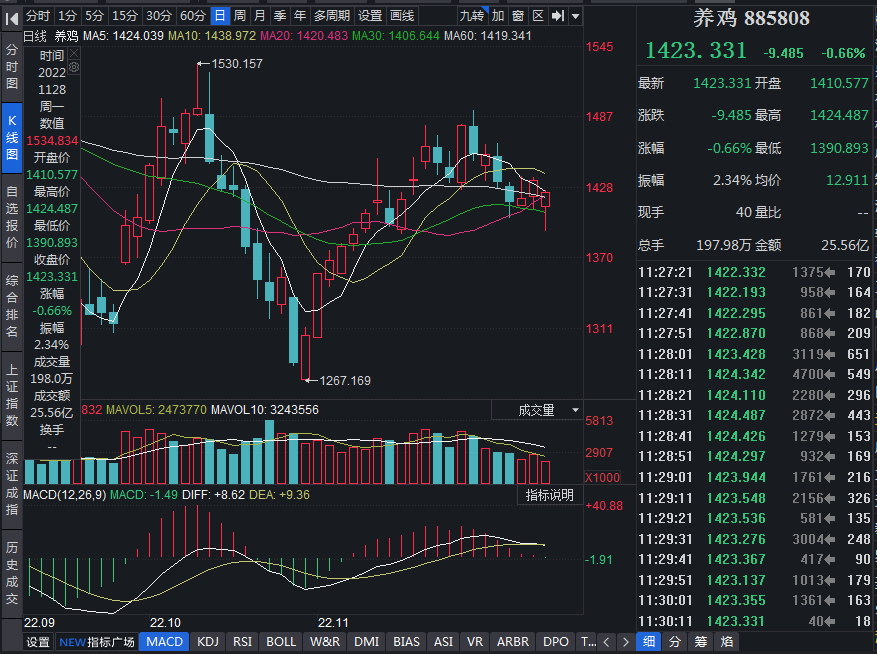 在雞苗及肉雞價格持續(xù)高位帶動下,同花順養(yǎng)雞概念板塊本月表現(xiàn)十分突出。同花順數(shù)據(jù)顯示,11月1日至11月25日,養(yǎng)雞板塊指數(shù)期間累計上漲9.83%,跑贏上證指數(shù)(期間累計漲幅7.2%)。板塊內(nèi)21只個股中共有19只實現(xiàn)上漲,占比超九成。個股方面,包括益生股份、禾豐股份、曉鳴股份、民和股份、圣農(nóng)發(fā)展等在內(nèi)的8只個股期間累計漲幅均超10%。