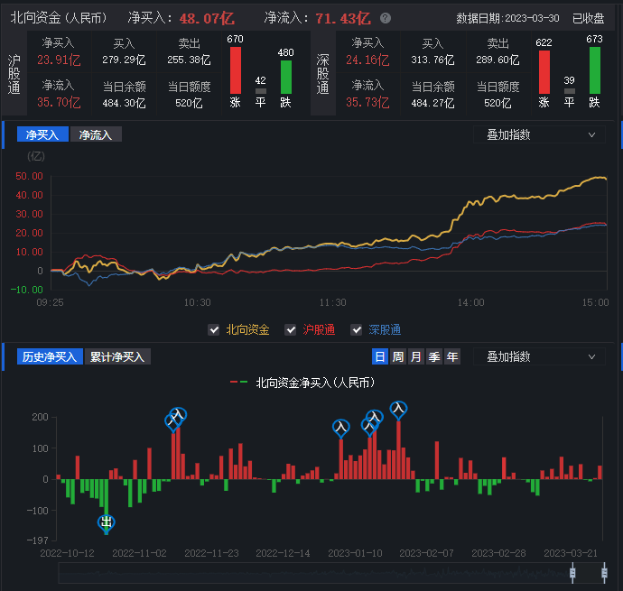 3月30日,兩市股指早盤震蕩回落,午后回升轉(zhuǎn)漲,創(chuàng)業(yè)板指震蕩上行。北向資金全天凈買入超40億元。業(yè)內(nèi)人士表示,當(dāng)前A股市場(chǎng)的各路機(jī)構(gòu)資金有望形成合力做多的態(tài)勢(shì)。