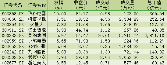 表:今日家用電器行業(yè)漲幅前十個(gè)股一覽