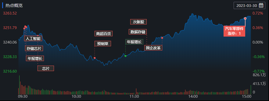 3月30日,A股三大指數(shù)走出”V”字反轉(zhuǎn),集體收漲,滬指結(jié)束四連跌。截至收盤,上證指數(shù)漲0.65%報(bào)3261.25點(diǎn);深證成指漲0.62%報(bào)11651.83點(diǎn),創(chuàng)業(yè)板指漲0.50%報(bào)2383.04點(diǎn),A股合計(jì)成交額9448.25億元,較上個(gè)交易日下降3.75%;北向資金全天凈買入48.07億元;其中滬股通凈買入23.91億元,深股通凈買入24.16億元。今日A股中有2949只下跌,1933只上漲。