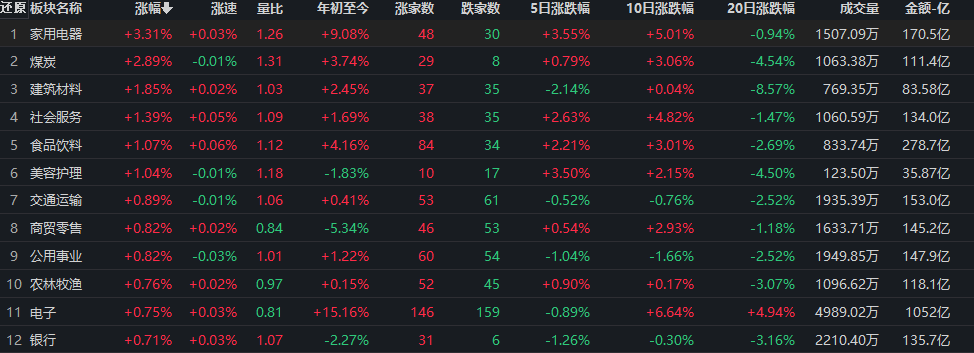 3月30日,行業(yè)漲多跌少,從31類申萬(wàn)一級(jí)行業(yè)看,有25類行業(yè)上漲,占比超八成,家用電器午后爆發(fā)漲幅居首,漲幅達(dá)3.31%;煤炭居第二位,漲2.89%;另有建筑材料、社會(huì)服務(wù)、食品飲料、美容護(hù)理等4類行業(yè)均漲超1%。6類下跌行業(yè)中,通信領(lǐng)跌,跌幅為3.11%;計(jì)算機(jī)、傳媒、環(huán)保、綜合、紡織服飾等5類行業(yè)分別下跌2.08%、1.39%、0.52%、0.12%、0.01%。