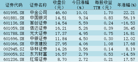 表:今日證券板塊漲幅前十個股一覽