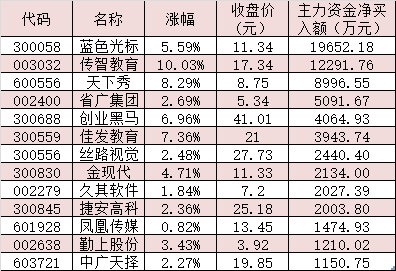 同時(shí),職業(yè)教育板塊內(nèi)共有31只概念股呈現(xiàn)大單資金凈買入態(tài)勢(shì)。其中,藍(lán)色光標(biāo)、傳智教育最受追捧,分別達(dá)到19652.18萬元、12291.76萬元,天下秀、省廣集團(tuán)、創(chuàng)業(yè)黑馬、佳發(fā)教育、絲路視覺、金現(xiàn)代、久其軟件、捷安高科等8只概念股均獲得2000萬元以上大單資金凈買入,這10只概念股合計(jì)吸金6.26億元。