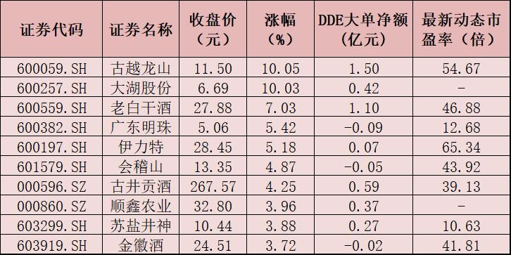 表:6月14日漲幅居前十的白酒概念股一覽