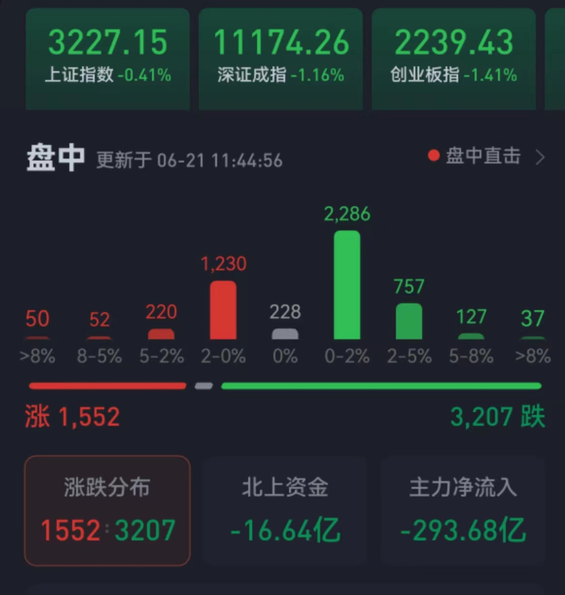 周三(6月21日),三大股指繼續(xù)震蕩回落。截至上午收盤(pán),上證指數(shù)跌0.41%,報(bào)3227.15點(diǎn);深證成指和創(chuàng)業(yè)板指跌幅分別為1.16%和1.41%;滬深兩市合計(jì)成交額6487.6億元,總體來(lái)看,兩市個(gè)股跌多漲少。