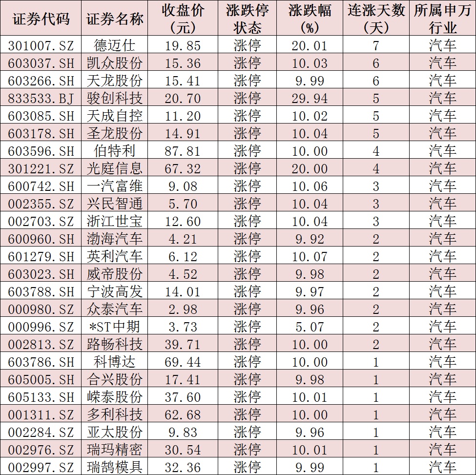 具體來看,今日,汽車產(chǎn)業(yè)鏈徹底爆發(fā),掀起了罕見的漲停潮,其中,胎壓監(jiān)測板塊領漲,路暢科技等5只個股漲停;新能源汽車概念股持續(xù)強勢,包括德邁仕、英利汽車等多只概念股漲停;無人駕駛板塊持續(xù)走強,得潤電子等16只概念股漲停;汽車零部件股集體走強,圣龍股份等23只個股漲停;創(chuàng)新藥概念股午后異動,海思科、通化金馬漲停;EDR概念、華為汽車、減速器、汽車芯片、車聯(lián)網(wǎng)、傳感器、英偉達概念、第三代半導體等板塊表現(xiàn)活躍。中船系板塊領跌,芬太尼、醫(yī)藥商業(yè)、毛發(fā)醫(yī)療、醫(yī)藥電商、房地產(chǎn)服務、電力、教育、銀行等板塊跌幅居前。