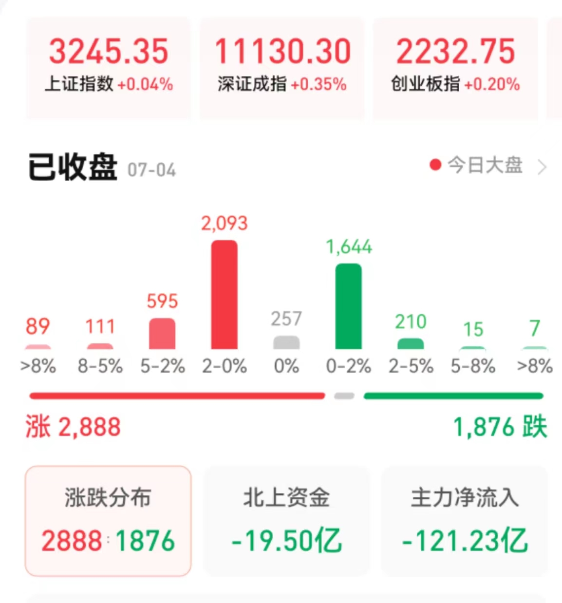 周二(7月4日),A股三大股指震蕩上行,全線飄紅。截至收盤,上證指數(shù)微漲0.04%報3245.35點,深證成指漲0.35%報11130.3點,創(chuàng)業(yè)板指漲0.2%報2232.75點,兩市合計成交金額達9293億元,北向資金凈賣出19.5億元。總體上看,兩市個股漲多跌少。其中,漲停個股達60只,跌停個股5只。
