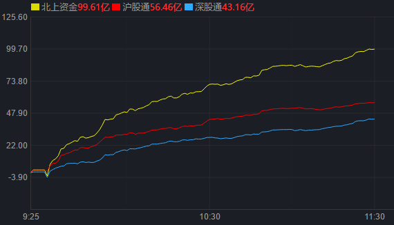 從資金面來看,7月13日上午,北上資金凈買入金額達99.61億元,其中,滬股通凈買入56.46億元,深股通凈買入43.16億元。