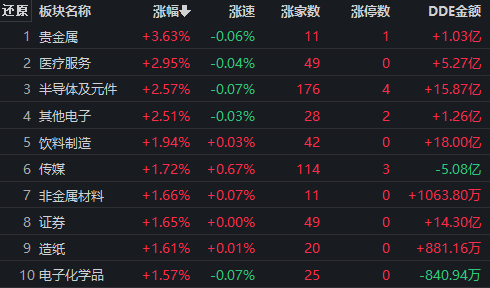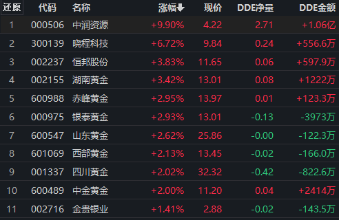 從早盤表現(xiàn)強勢的貴金屬行業(yè)看,交易中的11只成分股全線上漲,其中,有2只個股漲幅超5%。資金方面,有1.03億元大單資金凈流入該行業(yè),居12位。